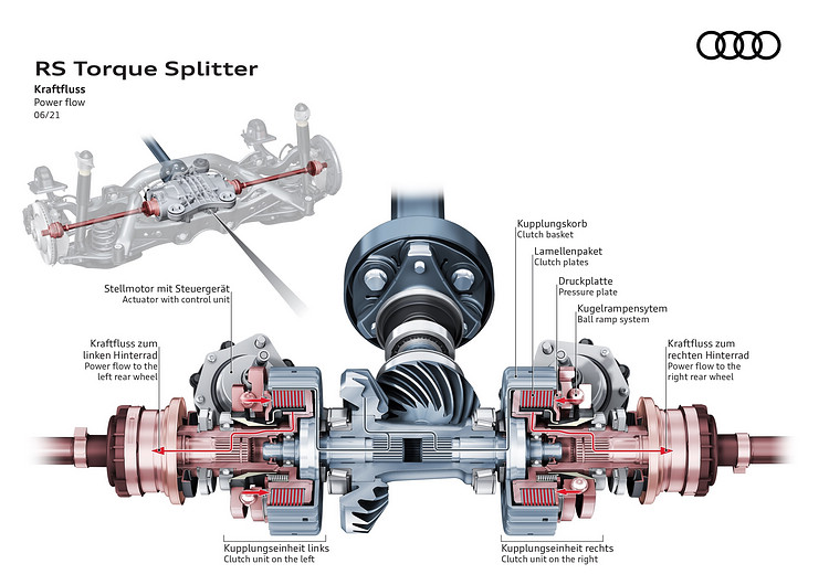 Audi這套稱為RS扭力分配器(RS Torque Splitter)的新技術,主要是用來提升quattro車款在彎道駕駛時的極限表現。擔任測試車手的Frank Stippler本身擁有機械工程學位,也受過車輛維修的歷練,因此能夠很快理解來自汽車的資訊回饋,這讓Meic Diessner可以根據他的描述即時修改對應的參數。根據Frank Stippler的說法,四輪傳動的汽車本身就有很好的循跡性,但在瀕臨極限時卻往往會出現轉向不足的現象,這套系統就是為了減緩這種現象而設計。