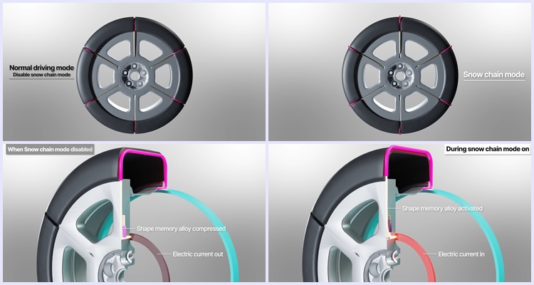 胎內會埋藏形狀記憶合金,當電流通過時,就會出現膨脹現象,因此當車輛行經崎嶇泥濘路面或需要使用雪地的路段,只需按一下控制鍵或螢幕上的功能,就能讓記憶合金恢復為原本的形狀,將鋼板外推到胎面之外,再也不用在冰天雪地安裝雪鏈讓手指凍傷。