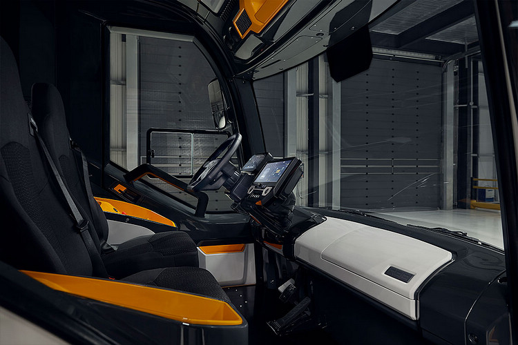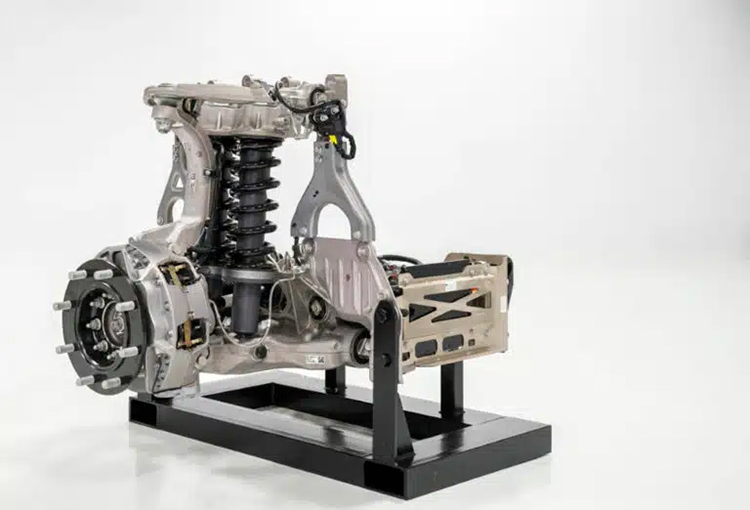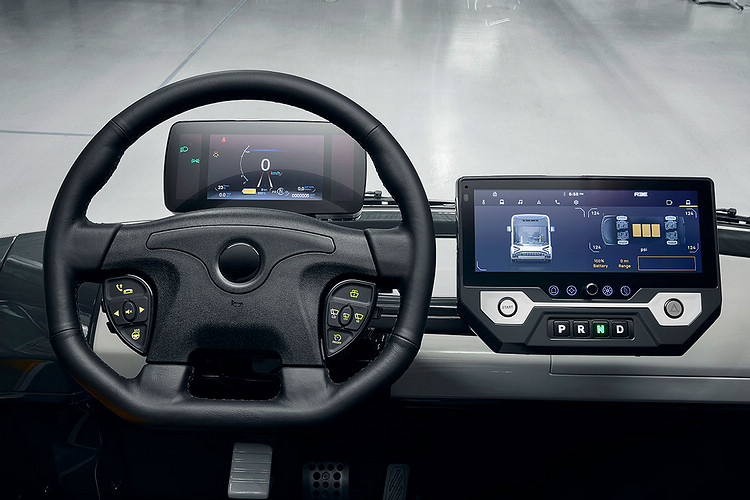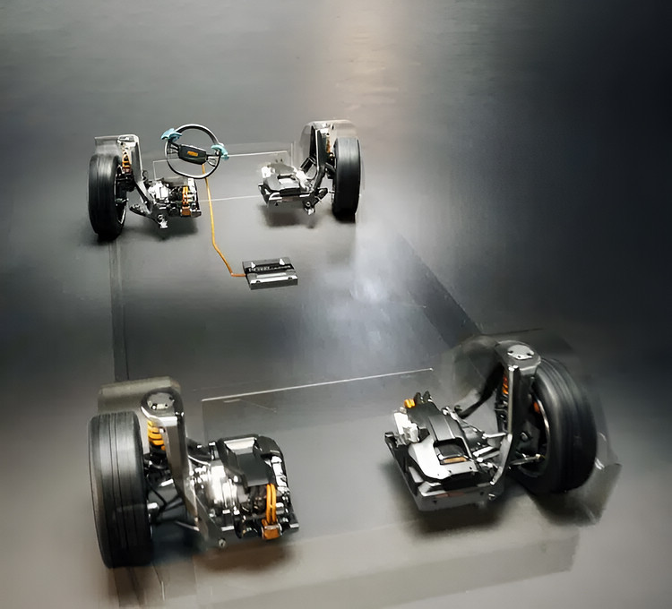 看起來如此簡潔的平台,實際上具體細節非常複雜,它的每組輕量車輪都透過極為緊湊的懸吊和轉向系統(而非結構)與馬達和變速箱連結,駕駛操控的行為也不是透過機械連結或液壓方式傳遞,所有一切都是以電子訊號來傳達,車輪上佈滿了大量的感測器,將各訊息回饋到行車電腦。