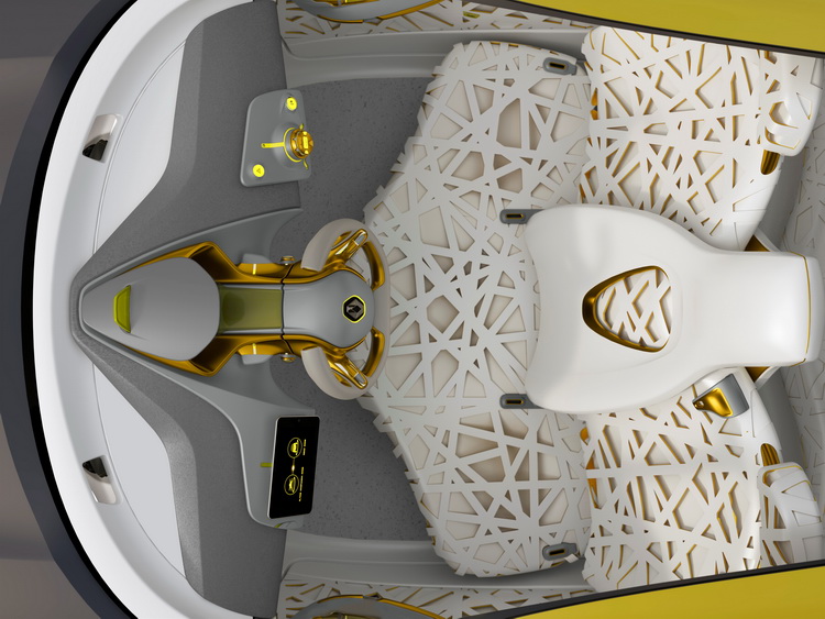 ![]() 至於內裝部分,則導入了「繭」的元素來營造舒適的居住感,設計上也自鳥巢汲取靈感。座椅給人輕盈明亮的感覺。另一個特別的地方則是駕駛座椅背後方的後座空調控制與出風口以同心圓方式整合在一起。「中控台」其實就是一台平板電腦,用來操作與導航控制「 Flying Companion」。