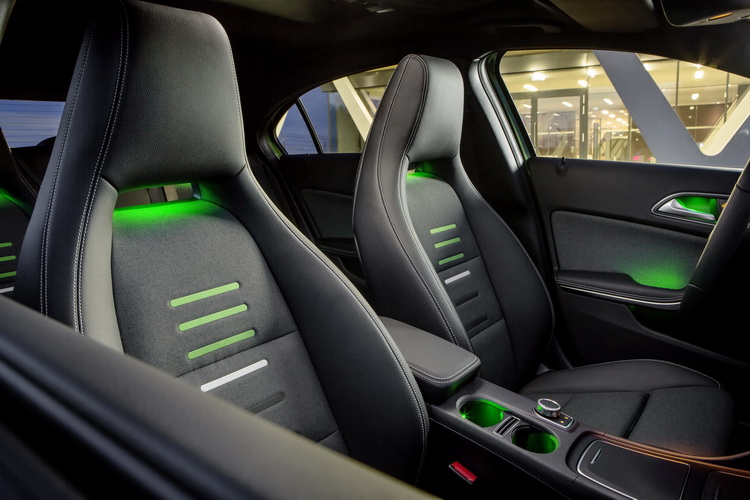而在車室內,新儀錶板風格與後來發表的CLA、GLA等兄弟車款有著一致的風格。針對車載影音資訊通訊系統的強化更是此次改款重點,高規車型上將八吋大型顯示螢幕列為標配。與智慧型手機的連結與整合更是重點,到2016年車上的影音資訊通訊系統就會具備Apple CarPlay(iPhone使用者)與MirrorLink功能,讓車主透過八吋大螢幕來操作手機功能。新的顏色與材質的鋪陳也為新A-Class帶來新的氣象並在質感上有所提升。