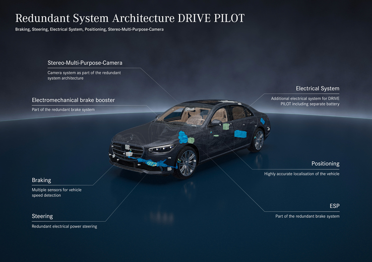 Mercedes-BENZ在德國所銷售的S-Class與電動車的EQS如果選配了「DRIVE PILOT」系統的話就可一在有條件地進行Level 3自動駕駛(德國政府當局初期是允許在交通量較大、比較塞車的情況下允許車主以DRIVE PILOT在60-km/h為上限的前提下使用自動駕駛。)。這也讓Mercedes-BENZ成為世界首家取得認證可有條件地在一般道路上進行Level 3自動駕駛的車廠。而現在Mercedes-BENZ也開始將Level 3系統的觸角伸向美國市場。