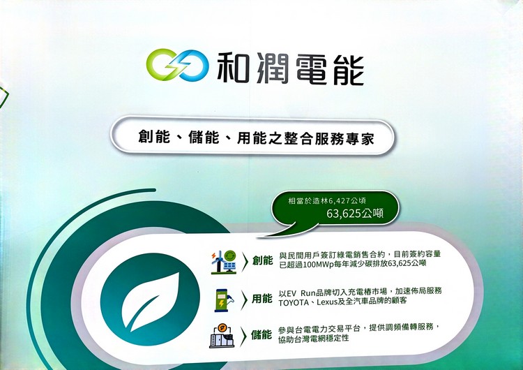 深化電能周邊事業 和潤電能提供創能、儲能及用能之整合性服務除了開拓氫能科技發展,和泰汽車亦於2022年5月成立和潤電能,提供創能、儲能及用能的整合性服務,並積極參與綠能投資。本次「台灣國際智慧移動展」中,和潤電能自有充電樁品牌EV-Run亦首度登台亮相,於展區展示快充及慢充充電樁,以及結合創能、儲能、用能之三合一模型,呈現其事業體多元化綠能發展樣貌。