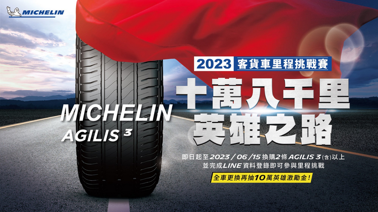 即日起至2023 年 6月15日,凡換購2條AGILIS 3輪胎(含)以上,並完成LINE資料登錄,即可參與2023 「MICHELIN AGILIS 3 十萬八千里英雄之路客貨車」里程挑戰賽。全車更換(全車四條/全車六條),並完成LINE資料登錄再抽10萬英雄激勵金!詳情請上米其林官方LINE查詢https://lihi2.com/8AeuM。