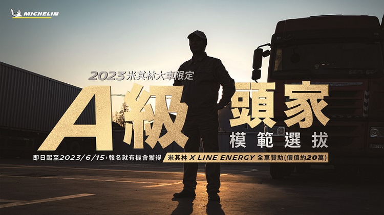米其林大車限定 A級頭家模範選拔逗陣來 有機會全車胎免費換新 為了致敬這群拚經濟的台灣頭家,台灣米其林特別推出「A級頭家模範選拔」,邀請擁有大貨車駕照的藝人李懿代表台灣米其林向所有運輸頭家廣發請帖,即日起至6月15日報名期間內,符合報名資格者,完成LINE資料登錄即可參加「A級頭家模範選拔」,就有機會獲得米其林全車贊助MICHELIN X LINE ENERGY輪胎 (價值約20萬元) 共五名,詳情請上米其林官方LINE查詢https://lihi3.cc/7Wz0Q或可於「2023商業車博覽會」期間至米其林A12攤位填寫紙本報名表。