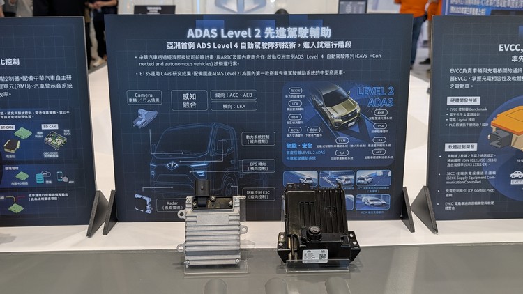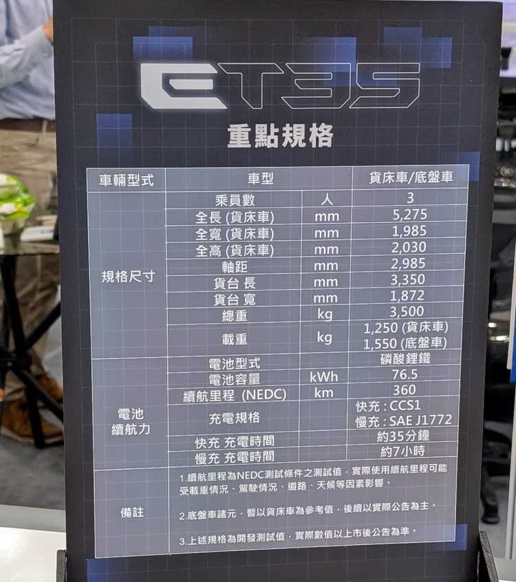 在去年新竹的電動物流車示範推動成果展示會上,由中華汽車自主研發的全台首部3.5噸電動商用車ET35首度亮相,不過當時並沒有公布太多規格數據。而在這次的「台灣國際智慧移動展」中ET35再次亮相,同時也帶來更多的相關資訊與規格數據。 ET35為國內首輛依循經濟部「智慧電動車十加一系統架構」開發完成的車型,並與工研院機械研究所共同合作開發底盤動力系統。為了這次的展出中華汽車也特別打造「全透明後斗底盤」讓觀展者可近距離觀賞車輛所配備之國產電池組、一體式電後軸及車用電子等關鍵零組件。