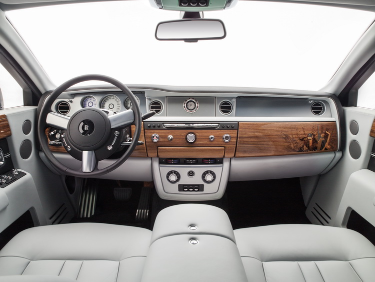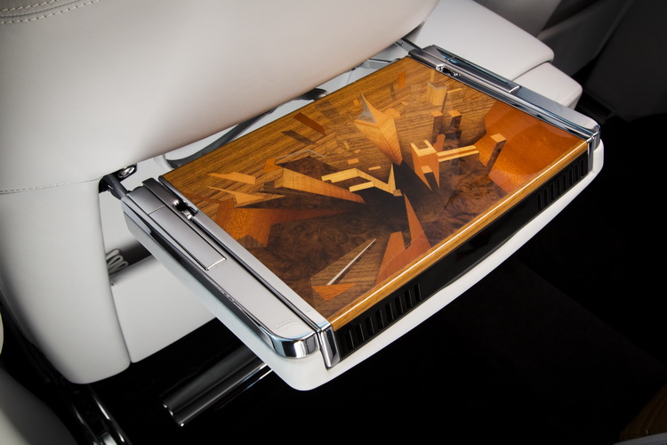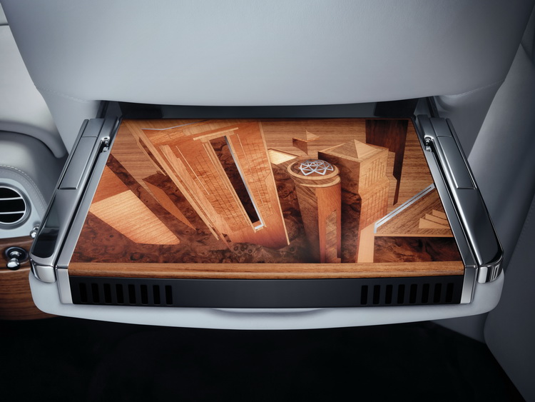 這部限量特仕車最大的亮點,就是在副手座前方與折疊餐桌部分都有以木片所拼接鑲嵌而成的大都會圖案,可別小看這個圖案,它們是由技藝精湛的木工師傅將500個不同顏色、大小、形狀的木片慢慢以手工拼接而成,完成一個折疊餐桌的圖案需要數日的時間,其工藝精巧程度不下於製作鐘錶,本身就是一個藝術品。