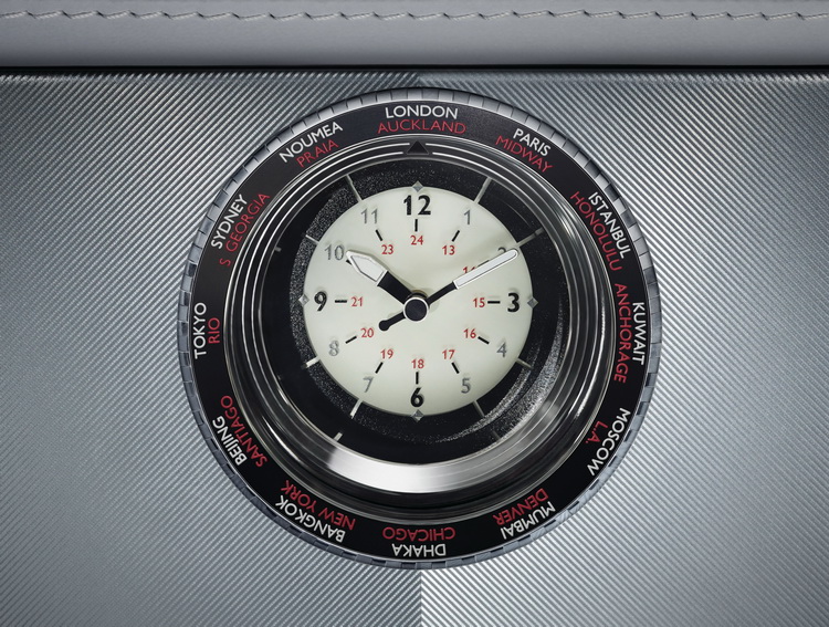 而在專屬的Aetherius Grey灰色真皮內裝中,後座椅中央椅背處以6800道雙色縫線繡出摩天大樓的圖案。中控台上的小鐘也是特別訂製,鐘盤外緣依照各個時區列出了包括巴黎在內全球著名的24個城市。