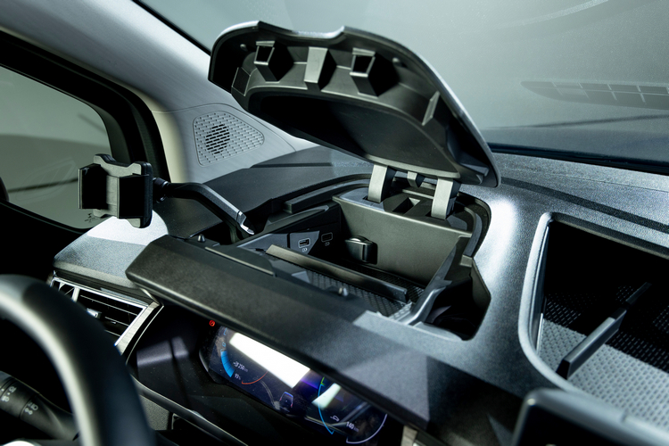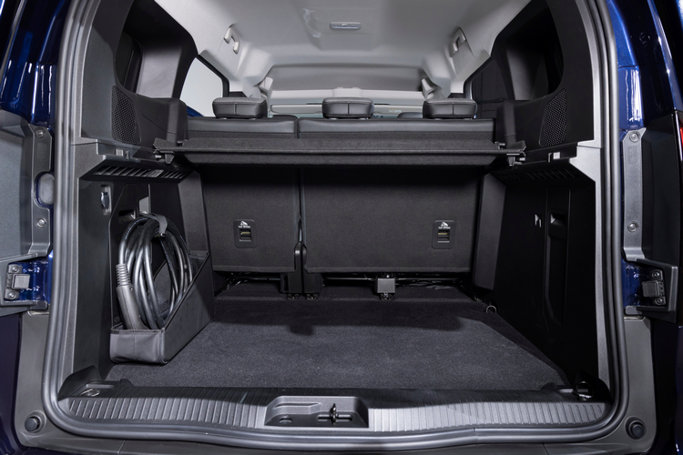 新Kangoo E-Tech Electric也號稱擁有同級最佳空間出入與居住姓。前門開啟角度達90度,後滑門的開口寬度達615mm,進出第二排非常方便。前方控台為水平基調設計,車上擁有豐富的收納空間設計,收納空間的總容量達49公升以上。行李廂在標準狀態下收納空間達850公升,將第二排座椅向前方滑移的話則可擴大至2500公升。