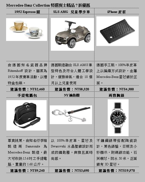 台灣賓士精心嚴選6項兼具時尚外型與高實用性的賓士精品,包括個性腕錶、質感吊飾、高級電腦包等,特別以7折專屬優惠價格回饋回廠車主,讓車主於日常商務、出差皆能展現不凡的個人品味。活動期間,凡車主回服務廠消費,即可享受精選配件優惠加價購。Mercedes-Benz禮遇車主,也讓您的愛車輕鬆增添夏日新裝。