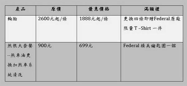 回廠消費不限金額即加贈M’way車型便條紙,更有消費滿額好禮,更換四條輪胎即贈Federal 原廠限量 T –Shirt 一件,購買煞車油更換加煞車系統清洗「煞很大套餐」即加贈Federal 精美鑰匙圈一個,以上贈品數量有限贈完為止。