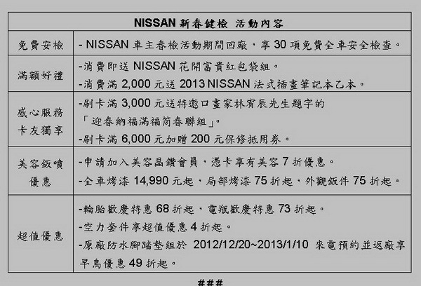 NISSAN新春健檢期間,車主回廠消費即可獲得「花開富貴紅包袋組」,滿2,000元加贈「2013法式插畫筆記本」。活動期間刷感心服務卡滿3,000元另有特邀口畫家林宥辰先生題字的「迎春納福滿福筒春聯組」,刷卡滿6,000元再贈送NISSAN保養禮券200元。讓車主在返廠消費的同時,也能獲得原廠貼心準備的精美滿額禮。