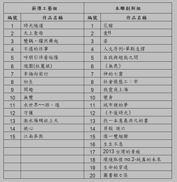 經過七位評審們的審慎評比,「第十七屆裕隆木雕創新獎」初選結果終於出爐,共計有35件作品入圍,名單公佈如下: