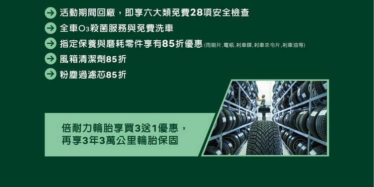 Škoda 2024 春季健檢活動共計進行六大類28項安全檢查,內容涵蓋:引擎、避震器、機油、剎車、變速箱功能、電瓶等。在春季健檢期間 Škoda 不僅提供指定保養與磨耗零件如:雨刷片、電瓶、煞車碟、煞車來令片、煞車油等可享85折優惠,風箱清潔劑與粉塵過濾芯更可享85折優惠,同時還提供倍耐力輪胎買三送一並享有3年3萬公里之輪胎保固。以高規格的原廠標準來守護您的愛車。