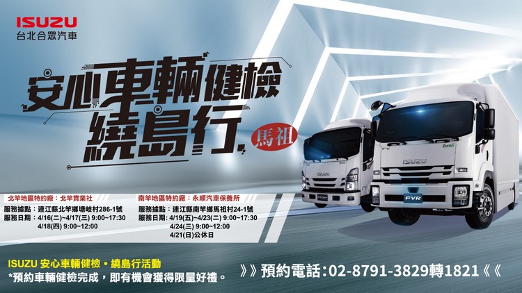 • 北竿地區 – 北竿實業社 地址:連江縣北竿鄉塘岐村286-1號 服務日期:4/16(二)~4/17(三) 9:00~17:30、4/18(四) 9:00~12:00 • 南竿地區 – 永順汽車保養所 地址:連江縣南竿鄉馬祖村24-1號 服務日期:4/19(五)~4/23(三) 9:00~17:30、4/24(五) 9:00~12:00 公休日:4/21(日) • 預約專線:02-8791-3829轉1821 預約服務時間:週一至週五9:00~17:30