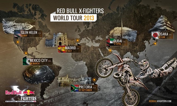 2013年RED BULL X-FIGHTERS 極限機車花式競技世界巡迴賽將於6月1日首次在日本點燃戰火。這是本賽季六個賽站中的第四個賽站,全球頂尖花式越野摩托車高手將匯聚日本大阪,上演精彩刺激的冠軍爭奪戰。日本車手東野高広(Taka Higashino)剛在上個賽站美國加州海倫峽谷贏得第三名,目前士氣如虹。