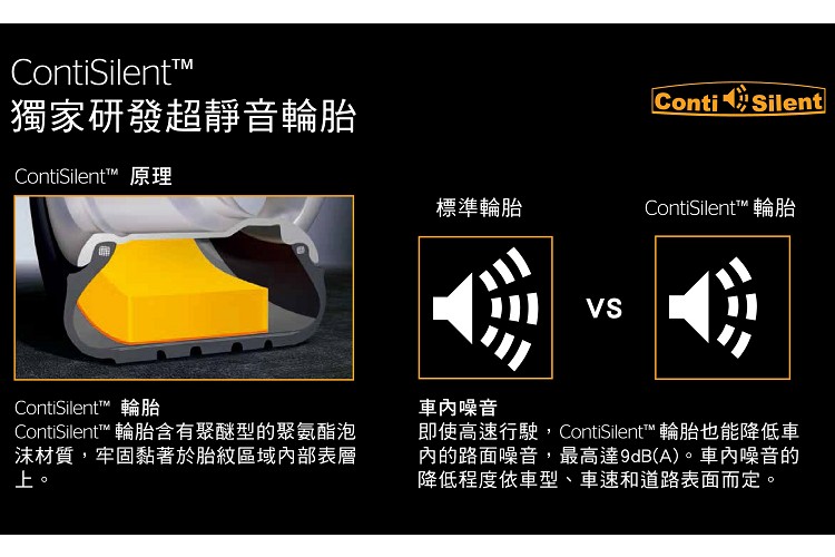 三大創新科技守護安全此外,針對現實生活不同路況考驗,德國馬牌輪胎更創新研發三大安全科技,ContiSealTM 胎面氣密型輪胎、SSR胎邊強化型輪胎、ContiSilentTM 靜音輪胎,給予車主更安全、更舒適的行車體驗: