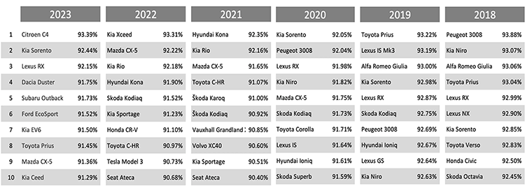 獲得這次車主滿意度調查第一名的是Citroen C4,這款車在英國的銷售表現一向不錯,過去已經有多達六次進入滿意度前十名,這次它的「駕乘穩定性」也取得所有車款的第一名,總成績也名列第一。車主對於Citroen C4普遍都給予很正面的評價。調查結果指出,最讓車主滿意的,分別是:乘坐及操控感、安全配備水準、油耗表現、可靠度與組裝品質,這些幾乎都得到了滿分的評價;至於外觀設計、動力表現、實用性和空間水準、整體性價表現,也獲得車主九成以上的滿意度,即使是唯一較差的內裝設計與資訊娛樂電裝配備,也能得到八成的滿意度。在所有車款之中,Citroen C4的前座舒適性排名第二,內裝品質排名第四,雖然後行李廂表現只排在第32位、駕駛座視野排在第68位、觸控螢幕靈敏度排在第59位,但兒童友善設計則排在第三位,最後以93.39%的滿意度成績,成為75款車的第一名。