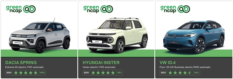 根據Green NCAP的全生命周期碳排評估,三款電動車的二氧化碳當量分別約為90至130 g/km,均明顯低於燃油車。經過整體評估,Dacia Spring與Hyundai Inster獲得Green NCAP頒發五星評等,Volkswagen ID.4 Pure 則是四星半,而作為參考對象的SEAT Ibiza汽油車也得到四星半的評價。
