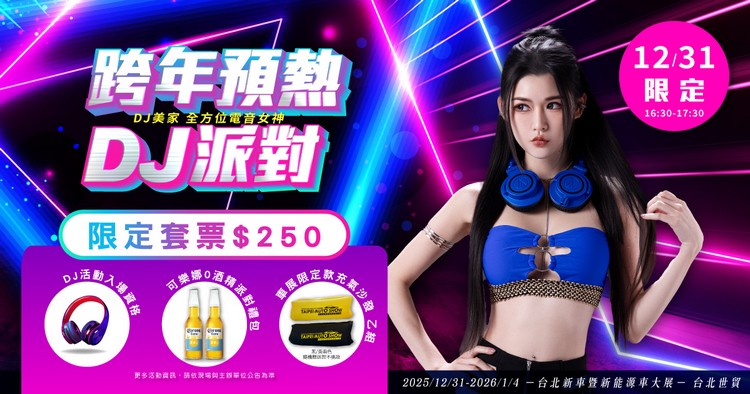富邦ANGELS將於 12 月 31 日(週三)13:00–13:50 甜美登車展舞台,卡洛琳、JESSY、檸檬三位人氣成員將在展場與粉絲近距離互動。「限量專屬互動票」將於 12 月 9 日中午正式開搶(限定活動門票不包含車展入場門票,需額外購買)。富邦ANGELS以亮眼舞台魅力、活力形象與高人氣成員著稱,每次現身都吸引大批粉絲支持,本次活動預料將掀起搶票熱潮。 跨年看車也能嗨翻!2026台北車展首度推出「DJ女神派對」 2026台北新車暨新能源車大展將於12月31日推出一日限定「跨年 DJ 派對」限定活動,打造全台唯一看車展、拿好禮、嗨跨年的盛大跨年新體驗!今年主辦單位首度與電音女神合作「DJ美家」,限量推出的「跨年 DJ 派對限定活動票」,只要250元(不包含車展入場票)即可擁有跨年DJ派對活動參與資格,並可獲得一份指定活動限定禮品。車展現場打造沉浸式舞台,讓觀眾在閃耀車款與震撼電音中一起暖身開跑、一路嗨到跨年倒數現場,提前引爆2026年的第一波狂歡熱潮,詳情請上官網查詢。
