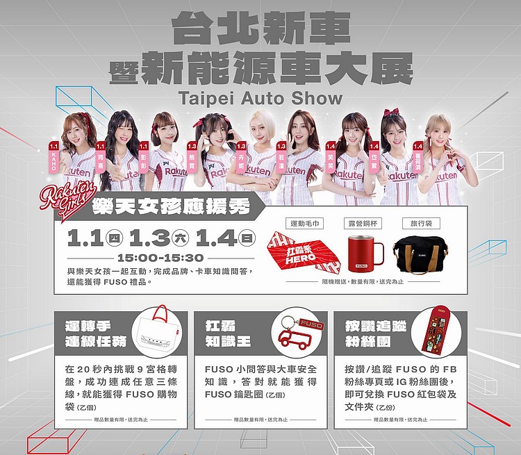 ![]() ▲FUSO 將於「2026台北新車暨新能源車大展」期間,在臺北世貿中心一館13-2號入口處與車迷相聚。現場將展示甫於上月發表的旗艦級重卡「New Super Great」、全台唯一的5噸電動輕型貨車eCanter,以及深受頭家信賴的國民貨車Canter堅達5噸小貨車。此外,FUSO更規劃一系列超好玩互動體驗,從「FUSO扛霸知識王」、「FUSO運轉手連線任務」到「樂天女孩應援秀」,搭配豐富的入場好禮,以輕鬆有趣的方式,讓不同年齡層的車迷在跨年期間感受FUSO挺車主、挺頭家的熱情與魅力。 ![]() ▲為炒熱展場氣氛,FUSO特別邀請樂天女孩應援。展區更規劃多項貼近車迷的互動體驗,包括「FUSO攤位打卡」,完成社群按讚與追蹤即可兌換入場好禮;「FUSO扛霸知識王」,挑戰品牌與大車安全小知識,展現你的扛霸實力;以及「FUSO運轉手連線任務」,透過九宮格轉盤連線,成功串起Super Great、Canter、eCanter關鍵字即可贏得好禮,讓大小車迷都能玩得開心、拿得滿意。