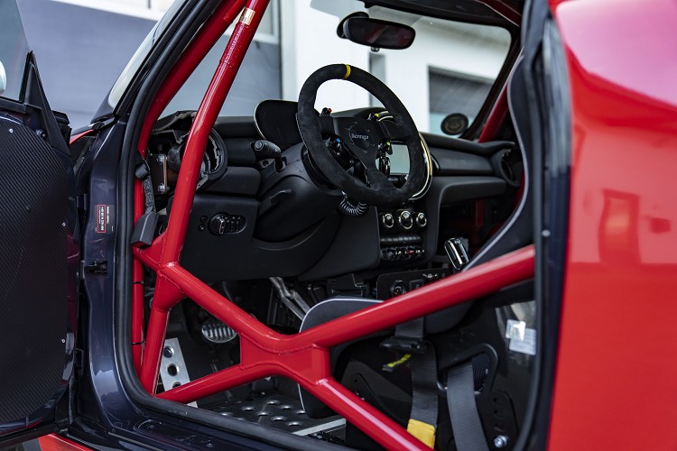 這輛經過改裝後的MINI John Cooper Works賽車,將參加紐柏林24小時賽事中的SP3T組別。首先車內配備一個特別符合規定的防滾架,並且於後方安裝一個100公升的防爆油箱,當然還有快速換胎所使用的快速氣壓頂高系統等,除了這些最基本的配備,針對動力性能方面也下足功夫。