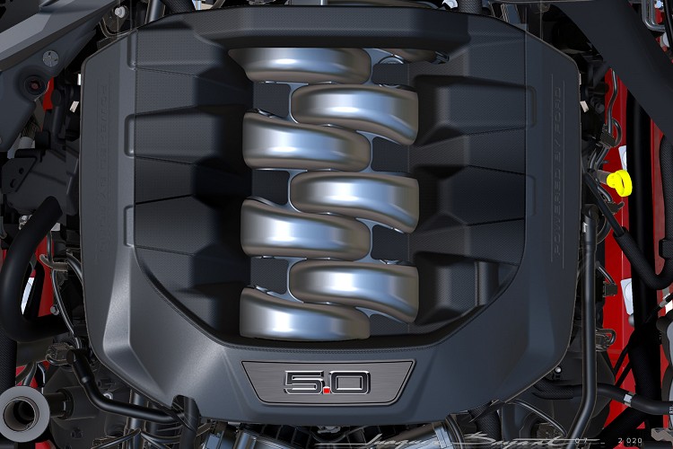 動力方面,還是維持現行款兩種動力選擇,入門款採用2.3升四缸EcoBoost,高性能版本則是5.0升V8自然進氣引擎。在V8 GT車型上,重新設計引擎前端部分,整體進氣管路加大,有效發揮32汽門系統的最大性能。為了要提供最好的散熱和熱效率,引擎蓋開孔進行造型調整,達到實際最佳功效。