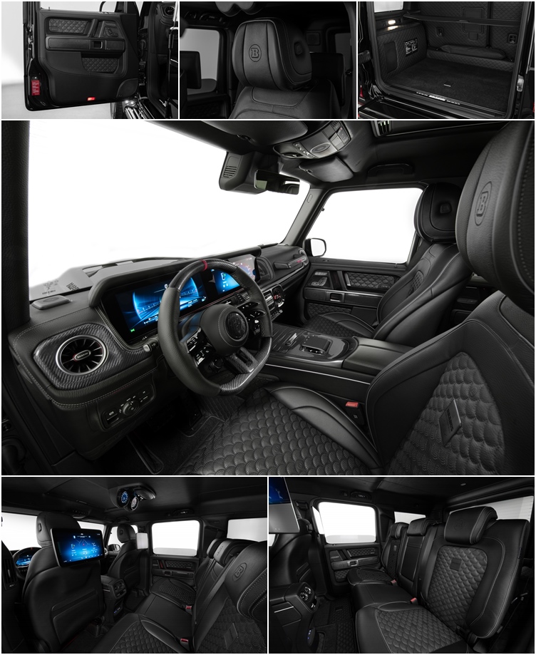 車室由BRABUS Masterpiece手工打造,採用頂級皮革與Dinamica微纖維,並點綴大量碳纖維與鋁合金元素 。比較特別的配備還包括具備LED換檔指示功能的碳纖維撥片,以及可開啟達90度的「Easy Entry」後門鉸鏈 。此外,每位車主還會獲贈一只與內裝風格一致的限量旅行包 。