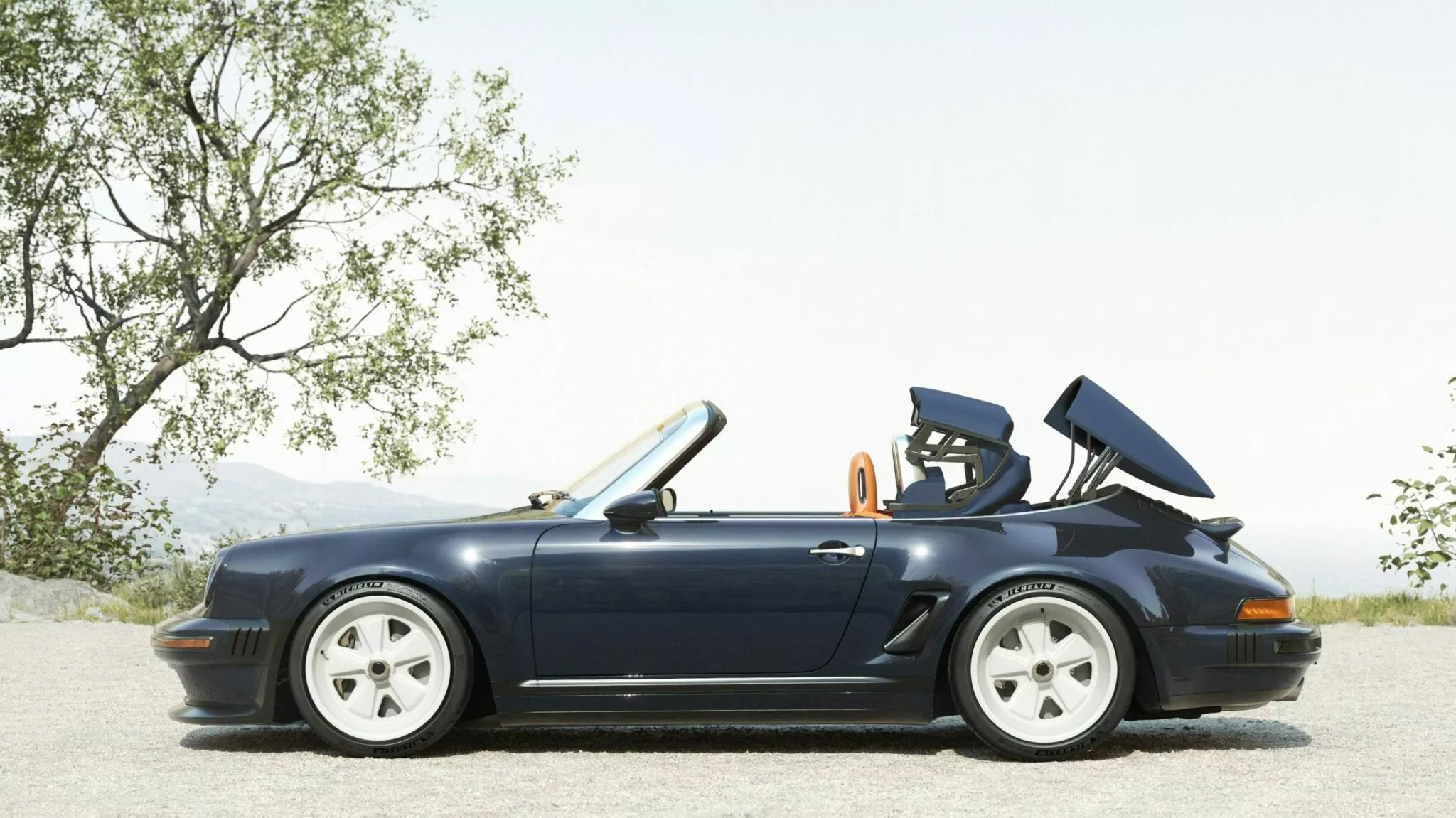 內裝鋪陳同樣展現高度客製精神。一輛採用 Ink 色真皮包覆輕量化賽道座椅,並以紅色元素點綴;另一輛則選用 Tangerine 皮革運動座椅。兩車皆強調手工縫製與拋光皮革接縫,細節質感相當講究。座艙內配備手工打造儀錶、新設計儀表台飾板與重新詮釋的三輻式方向盤,在忠於年代氛圍的同時,也融入現代科技配備,包括空調系統、導航與 Apple CarPlay,兼顧日常實用性。敞篷機構方面,Singer 為其設計輕量化 Z 字形折疊結構,使車頂無論升起或收納皆維持流暢車身比例,避免傳統敞篷 911 常見的厚重視覺效果,整體線條依然俐落。
