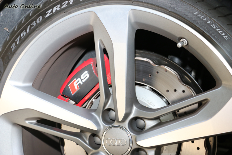 ![]() ▲電動升降式尾翼是外觀少數顯露出來的性能指標。![]() ▲浪花碟盤、紅色卡鉗組與21吋輪圈都是它的標配。