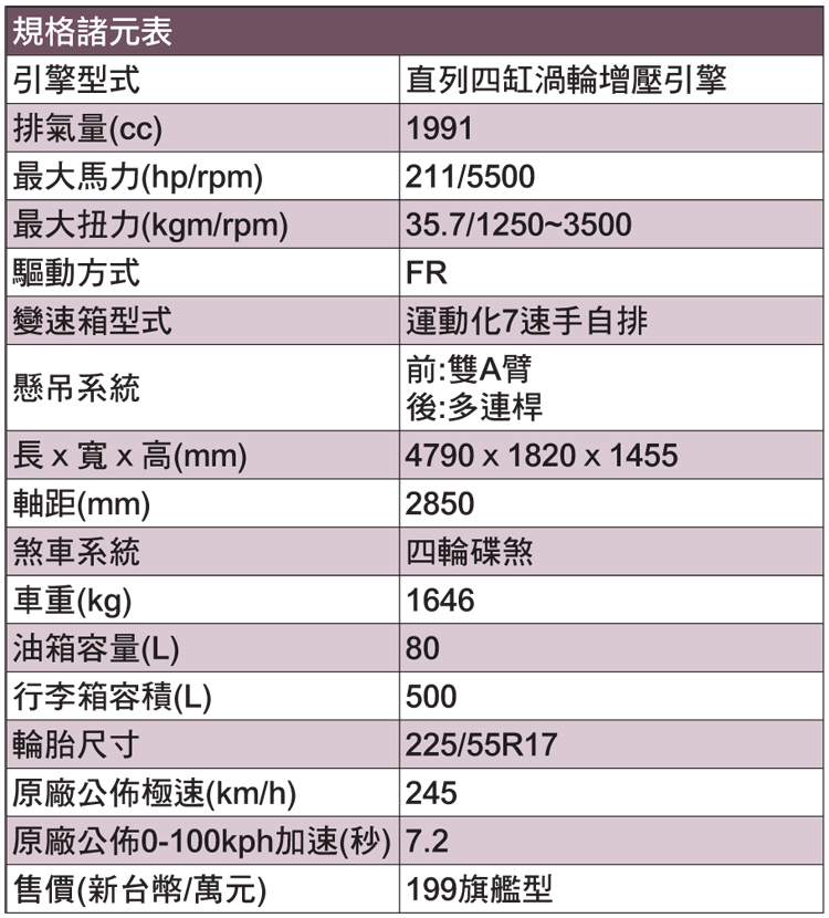 ![]() ▲INFINITI與M-Benz共同合作,導致Q50 2.0T與C250使用相同引擎。動力部分,Q50 2.0T搭載一顆由M-Benz設計生產的2.0升四缸渦輪增壓引擎,就是與C250相同的引擎本體,透過各家車廠經驗有調校上差異。最大馬力211ps/5500rpm與最大扭力35.7kgm/1250~3500rpm與C250一模一樣,搭配七速運動化手自排。不過因為車重與電腦設定影響,加速表現比起C250的6.6慢很多,只比C200快0.1秒為7.2秒。底盤調校上,Q50感覺刻意要走操駕樂趣風格,但為了顧及消費客群,妥協在舒適性中盡可能呈現操控樂趣。