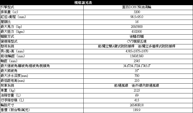 自去年開始從日本引進的Pajero是搭載3.2升排氣量DI-D直列四缸柴油渦輪引擎,與過往引進Pajero所搭載的3.8升V6汽油渦輪引擎不同,動力數據則為200hp/3800rpm最大馬力與45kgm/2000rpm最大扭力,光看這扭力數據就知道利用柴油引擎低轉速高扭力輸出的特性可為這部越野本位的SUV在從事Off Road活動時提供更大的優勢,在一些抓地狀況不佳的路面上輪胎依然有足夠的驅動力讓車輛行進、脫困。