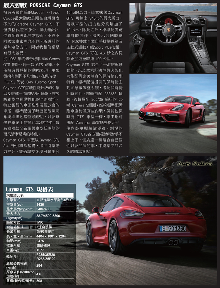 如果以E-Type為範例 它絕對值得買!![]() ▲如果以E-Type為範例,F-Type絕對值得買!Jaguar F-Type Coupe在台灣售價為一般版本395萬元,R版本768萬元,以價格來看同級對手最接近398萬元的Porsche Cayman GTS。兩者除了價格外,最大馬力非常有默契同為340hp;不過在加速表現上,Cayman GTS比起來自英國的F-Type Coupe快了0.7秒為4.6秒,而極速一樣是Cayman的284km/h領先對手。但車並非性能越強悍就越好,畢竟你要買的不是一輛賽車,開車模式也不是只有激烈駕駛。不得不承認,Cayman GTS比F-Type Coupe有樂趣許多,中置引擎後輪驅動,激烈駕駛就像在跟車搏鬥,要馴服它是需要一點技術,就是有人喜歡享受在這種與車爭奪主控權的刺激。反觀F-Type Coupe動力不是最頂尖,但也不會讓人無樂趣,前置引擎後輪驅動比起中置引擎後輪驅動好駕馭,沒有太多車輛本身的神經質,比起對手駕駛感覺優雅許多。 ![]() ▲全景天窗降低跑車帶來的壓迫感。但有一點我絕對可斬釘截鐵告訴你,如果要論經典、歷史,那一定是F-Type Coupe莫屬。看看D-Type、E-Type不難發現,隔了那麼多年Jaguar才推出可以接替經典車型的新生代,由其實F-Type Coupe的美臀,Jaguar設計總監Ian Callum表示,大部人都只能看到跑車的車尾,所以我就要設計一輛美臀跑車讓大家忌妒,而這設計也剛好能將E-Type的經典繼續流傳。另外,C-Type、D-Type和E-Type的著名設計,早已是博物館裡的經典收藏,Jaguar斗膽再將這名子拿出來使用,一定有它的自信,如果你想信Jaguar的眼光,快點收藏一輛吧!或許等個三五十年,價格就會翻漲數倍。