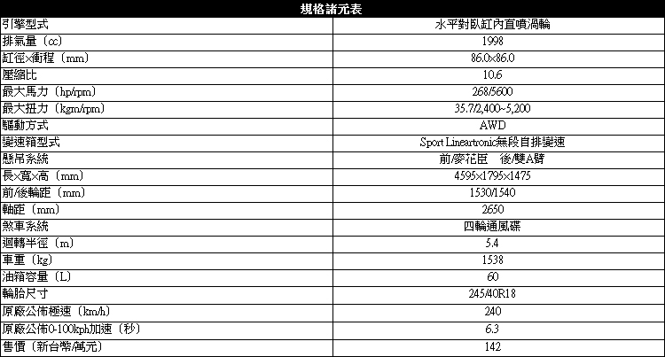 ![]() ▲01 WRX在這次小改款中都做了許多進化,雖然不是什麼特別大的項目,但就像女人化妝一樣,只要到位就有優點放大的效果。WRX在這次小改款中都做了許多進化,雖然不是什麼特別大的項目,但就像女人化妝一樣,只要到位就有優點放大的效果。喜歡Subaru的消費者大多數都是看上它的水平對臥與AWD四輪傳動,這就是它的特色,而會選擇WRX的消費者更是看上它的運動因子,我也因為這樣曾經買了一台。改款後原廠對於售價做了微調,WRX 2.0 CVT從原本的139萬元調整到142萬元,改款後的幅度是否有3萬元的價值,這沒有一定標準,就要看你對於它的價值。 ![]() ▲論市場上想要有渦輪增壓水平對臥引擎,又要有AWD我想就只有Porsche。
