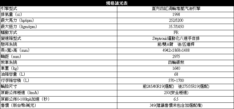 強悍動力帶來快樂出遊![]() ▲動力搭載2.0升四缸渦輪增壓引擎代號B48,動力輸出提早又快速。別看到530i就以為是用3.0L引擎,BMW對於車名早已做了修正。動力搭載2.0升四缸渦輪增壓引擎代號B48,看似與先前N系列有些雷同,但其實內部做了修改變,一樣有TwinScroll雙渦流增壓、HPI高精準燃油缸內直噴、Double-VANOS雙可變汽門正時系統等技術,最大改變是將氣冷式的渦輪進氣冷卻氣改成水冷式,這樣的好處可以縮短渦輪管路,提早達到正壓輸出最大動力。最大馬力與前一代引擎相比,馬力增加達到252hp在引擎5200rpm時產生,扭力則維持不變為35.7kgm,最大輸出轉速下修至1450rpm,動力輸出更早又更快速。 ![]() ▲後輪驅動設定搭配上較重的車尾,穩定性比起四門轎車好很多,車尾沒有浮浮的感覺。