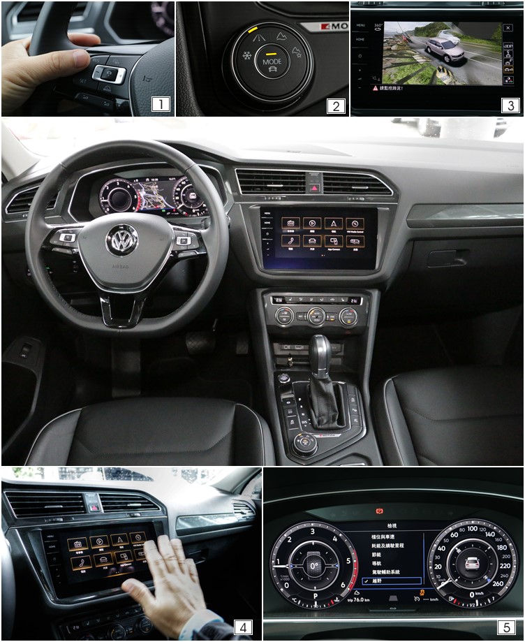內裝完整更實用![]() ▲考量到後座使用機率和尺碼的問題,5+2的車型還是多數人的選擇。駕駛座艙的控制介面同樣比照Tiguan,都是把儀錶台和中控台整合成為一體,出風口和面板都是以稜角分明的設計作為視覺元素。至於Tiguan Allspace 400 TDI Highline作為車系旗艦,配備自然相當完整;標配的真皮運動型座椅就有電熱、記憶和電調功能,三區恆溫空調和換檔撥片也是標配,同時搭載全邏輯數位儀表和最高等級的9.2吋全平面觸控螢幕,內建衛星導航系統。 ![]() ▲(1)Tiguan Allspace 400TDI HL標配疲勞警示、ACC和車前碰撞預警等系統。(2)按下智慧型主動式控制選擇鈕的中央就能直接進入事前預設的模式。(3)話題性十足的環車影像輔助系統,在這款車上必須加價選配。(4)9.2吋全平面觸控螢幕容易留下指印,不過可以利用手勢控制進行操作。(5)Tiguan Allspace 400TDI HL標配疲勞警示、ACC和車前碰撞預警等系統。
