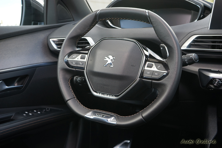 與上代沒什麼功能與設計性的方向盤相比,新3008換上小盤徑的真皮方向盤,且上下緣皆為平輻設計,除方便駕駛者判位外,也比較不會遮到判讀儀錶板的視線。握輻的造型也有人體工學設計,讓駕駛者可以更舒適就手地握住且虎口/拇指部分有一定的固定性。上面的按鍵則可操作音響、通訊、定速及行車資訊顯示調整等功能。