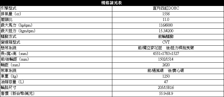 ![]() 改良後的動力,搭配不錯的底盤懸吊調校設定,轉向時提供很好的穩定性,即時是比較激烈的急彎轉向,車身也不因重心偏移導致車尾動態不安定,或有明顯轉向不足傾向。可惜在轉向上方向盤左右死點圈數略多,且轉動手感偏輕,對運動化操駕較不利。但話說回來,以其鎖定的開車新鮮族來說,可以提供輕鬆而安定的操控與車身動態才是優先重視之處。