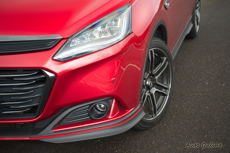 例如頭燈邊框暗色處理、廠徽兩側與水箱罩的黑色飾條,以及黑色碳纖維紋路的專屬空力套件等,後視鏡外殼也以消光黑來處理,與試駕車的紅色車身搭配也營造出一些視覺上的對比與個性感。