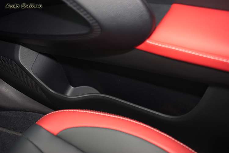 前座椅椅墊兩側也設有小置物盒,如果手機放得下的話放這裡不錯;前後車門內側置物空間都可以放進飲料瓶罐(前大後小),後座中央扶手也有兩個置杯座,在車內喝飲料要找地方放應該不是難事。