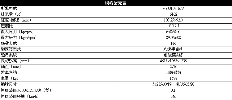 第一次在台灣道路上試駕美式超級跑車,整體的駕馭感受與之前試駕過的大黃蜂Camaro、Challenger或者Mustang野馬有很大不同。原以為會有很強的笨重感,說奇怪他卻非常靈活,前輪轉向精準不拖泥帶水,後輪在強大輸出壓制下,油門多一點車尾就會跑得比車頭快,好在輪胎寬度夠不自於太神經質。前後懸吊都採用雙A臂結構,桶身採用第三代電磁控制阻尼,不同模式下軟硬度不同,當然其它像是油門反應、變速箱檔位以及排氣聲浪也都會跟著模式不同有所改變。 ![]() ▲靜止加速到百公里只需要3.3秒,極速超過300km/h以上的性能。![]() ▲紐柏林北賽道成績 7分13秒9,台灣大鵬灣賽車場1分52秒09,以上都證明它的實力超過大家所想。