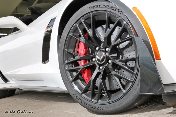 ![]() ▲選配Z07 Performance 套件包含全車進化版空力套件。從外觀來看它非常有霸氣,長車頭短車尾加上誇張的空力套件,不只外觀好看也符合該有的下壓力,所有的種種都是因應性能所考量。外觀的設計也反映了所需的冷卻系統,像是前引擎蓋上方的開孔,可謂中冷氣帶來最佳熱交換氣流;前後葉子板的開孔也是考慮到高速時快速帶走不穩定氣流,搭配上車尾上方可調整尾翼,依照賽道要求調整適合的下壓力。 ![]() ▲可調式半透明後尾翼依照需求調整不同下壓力。Flowing Ocean 孚海國際與台中經典車業引進的Corvette Z06有選配Z07 Performance 套件,套間包含全車進化版空力套件、可調式半透明後尾翼、Michelin Pilot Sport Cup 2 輪胎、Brembo 碳纖維陶瓷煞車系統。整體的性能指數比起一般車型提升很多,尤其在煞車上,Z07套件搭載前394mm x36mm與後388mm x33mm的碳陶瓷煞車碟盤,與一般碟盤相比重量輕了10公斤左右,前六後四的Brembo卡鉗,帶來最佳的煞車力道。 ![]() ▲碳陶瓷煞車碟盤與一般碟盤相比重量輕了10公斤左右。