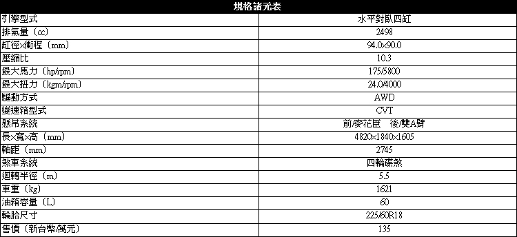 高底盤通行無阻 動力順暢無拘束![]() ▲搭載代號FB25的2.5升水平對臥四缸引擎,擁有最大馬力175hp和最大扭力24kgm。動力部分,搭載代號FB25的2.5升水平對臥四缸引擎,擁有最大馬力175hp和最大扭力24kgm,本次改款除了引擎本體的優化調校與重量減輕8%外,新型的交流發電機更大幅提升燃油效率,而重新精進CVT無段自排變速箱的換檔設定,不僅能減低車室噪音,節能效率更是進步了3%,而更上層樓的油門踏板優化設定,賦予車輛精準綿密加速反應。