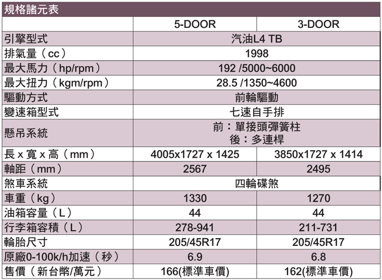 新變速箱帶來直接力度![]() ▲兼顧舒適性以及操駕樂趣是BMW集團近期轉變方向。我們試駕的為MINI COOPER S高階版本,搭載一顆2.0升的渦輪增壓引擎;科技方面除了渦輪增壓技術外,缸頭上蓋改以碳纖維複合材質(CFRP)打造,達到MINI對於輕量化的訴求。2.0升渦輪增壓引擎最大馬力為192hp/5000-6000rpm與最大扭力28.5kgm/1350-4600rpm最大扭力,搭配上1300公斤左右的車重,跑起來輕快、順暢。 ![]() ▲科技方面除了渦輪增壓技術外,缸頭上蓋改以碳纖維複合材質(CFRP)打造,達到MINI對於輕量化的訴求。![]() ▲換上雙離合器自手排變速箱,檔檔的銜接快速且直接,進彎前的收油降檔再補油出彎,檔位齒比能把引擎hold在最有爆發力的時機點。行車模式有Sport(運動)、Mid(一般)及Green(節能)三種,切換鍵從原本排檔座改到中控台下方,藉由駕駛者需求可任意改變車輛狀態。市區行駛時Mid符合絕大多數消費者對車的要求,Green模式提供最大節能狀態,當然Sport是我最喜歡開的模式,進入Sport模式,油門反應靈敏、變速箱延遲換檔,動力隨傳隨到,山中過彎行雲流水。而不得不承認MINI在底盤調校上的功力,與前代車型相比不再只有硬梆梆,同時兼顧舒適性以及操駕樂趣是BMW集團近期轉變方向。 我們實際在大魯閣卡丁賽車場內做激烈駕駛,3-DOOR的靈活度比起5-DOOR優異,畢竟兩者的軸距差了72mm,刁鑽的小彎明顯感受不同。換上雙離合器自手排變速箱,檔檔的銜接快速且直接,進彎前的收油降檔再補油出彎,檔位齒比能把引擎hold在最有爆發力的時機點,只是激烈的跑了幾圈下來,煞車顯得不太夠用,但這只侷限在激烈急加速、急煞車的小賽道中,如能選配上JCW四活塞卡鉗就完美了!