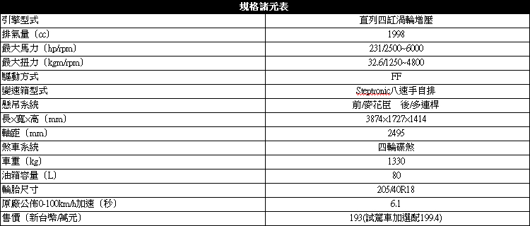 ▲2.0升直列四缸渦輪增壓最大馬力從231hp/5200~6000rpm,而最大扭力32.6kgm/1250~4800rpm。