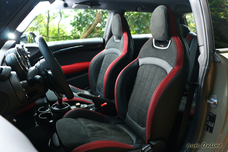 坐進駕駛座,感受到JCW座椅更戰鬥,半皮半麂皮包覆搭配上左右支撐性,能抵抗G值造成的身體滑動。