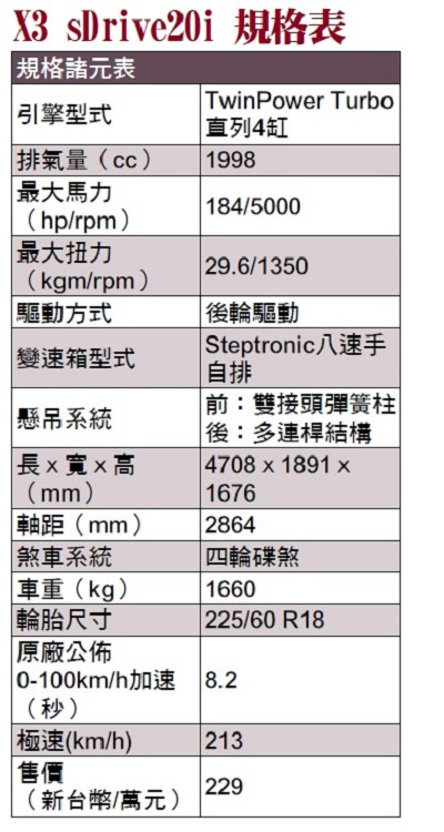 ![]() X3 sDrive20i主要改變大概就是用四輪驅動系統換主動安全輔助功能,其餘則維持先前xDrive20i設定。動力與xDrive30i相同,搭載2.0升四缸渦輪增壓引擎,不過在調校上面刻意降低整體輸出,最大馬力184hp/5000rpm與29.6kgm/1350rpm最大扭力,並搭配Steptronic八速手自排系統,加速力道順暢不拖泥帶水,靜止加速到100km/h實測約8.5秒,稱不上猛爆卻迎刃有餘。 ![]() ▲動力與xDrive30i相同,搭載2.0升四缸渦輪增壓引擎,不過在調校上面刻意降低整體輸出。