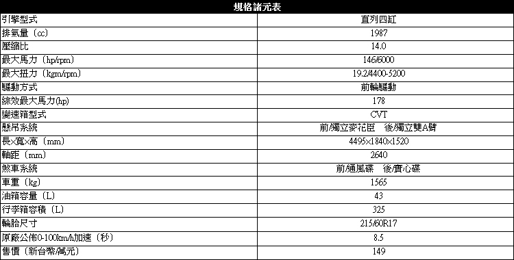 比較偏弱的地方則是在行李廂部分,只有325公升的容積(行李廂地板下為備胎與工具組收納空間),比一些車身尺碼更小的對手或掀背車都還少,以出遊的行李收納來說可能行李都不夠放,想放置自行車之類的戶外休旅器材就更困難,6:4分離可倒的後座椅背放倒後可以擴大收納容量至1000公升,與對手相比還是偏弱。