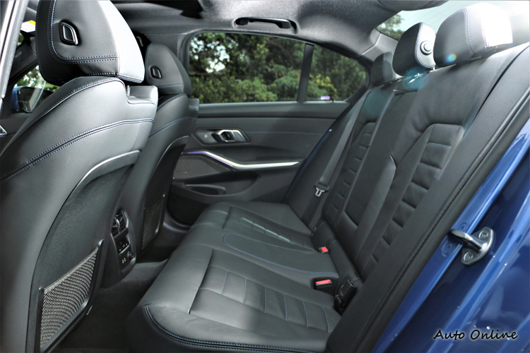 號稱史上車格最大的3系列,座艙內大小當然不在話下,乘坐空間表現也能算是3系列有史以來最寬敞。而BMW對於乘坐舒適性有著自己的標準,座椅材質偏硬、後座椅背過直,激烈操駕提供最佳包覆性,但長途乘坐略感到不適。後座空間變大之餘,後廂容積也來到480公升,再搭配40/20/40分離可傾倒後座椅背,帶來更多元化的實用機能性。行李廂尾門備有腳踢感應,就如同開啟車門一樣不須拿出鑰匙,腳一踢尾門自動開啟,再踢一下則會自動關閉。