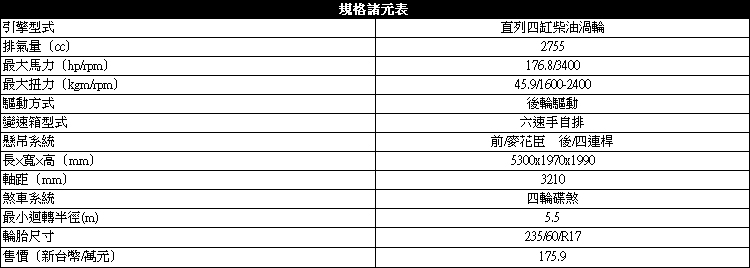 加速輕快、乘坐舒適![]() ▲Granvia搭載一具1GD 2.8升四缸柴油渦輪增壓引擎,最大馬力有176.8ps/3400rpm與最大扭力45.9kgm/1600-2400rpm。動力方面,Granvia搭載一具1GD 2.8升四缸柴油渦輪增壓引擎,最大馬力有176.8ps/3400rpm與最大扭力45.9kgm/1600-2400rpm,採用DPR柴油碳微粒主動濾清排氣處理系統,無須添加尿素,可節省商旅車主長期的營運成本。後輪驅動配置結合六速手自排系統,順暢的加速有效發揮柴油低轉速高扭力優勢,另外在市區的迴轉半徑達到5.5m是同級車之冠。懸吊系統是Granvia另一項優勢,前懸吊為麥花臣、後為四連桿結構,與多數商旅車使用的葉片彈簧或者拖曳臂型式相比,能帶來更高車輛舒適性及穩定性。 ![]() ▲實際上路試駕體驗感受到大排量柴油引擎的優勢,車重超過兩噸卻能帶來輕盈的加速感。![]() ▲偏向柔軟的避震器設定,可抑制路面坑洞帶來的跳動,而且載越重效果越好。